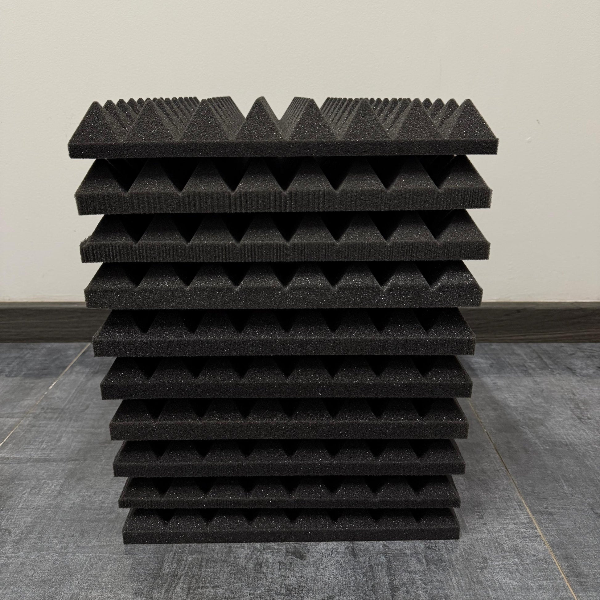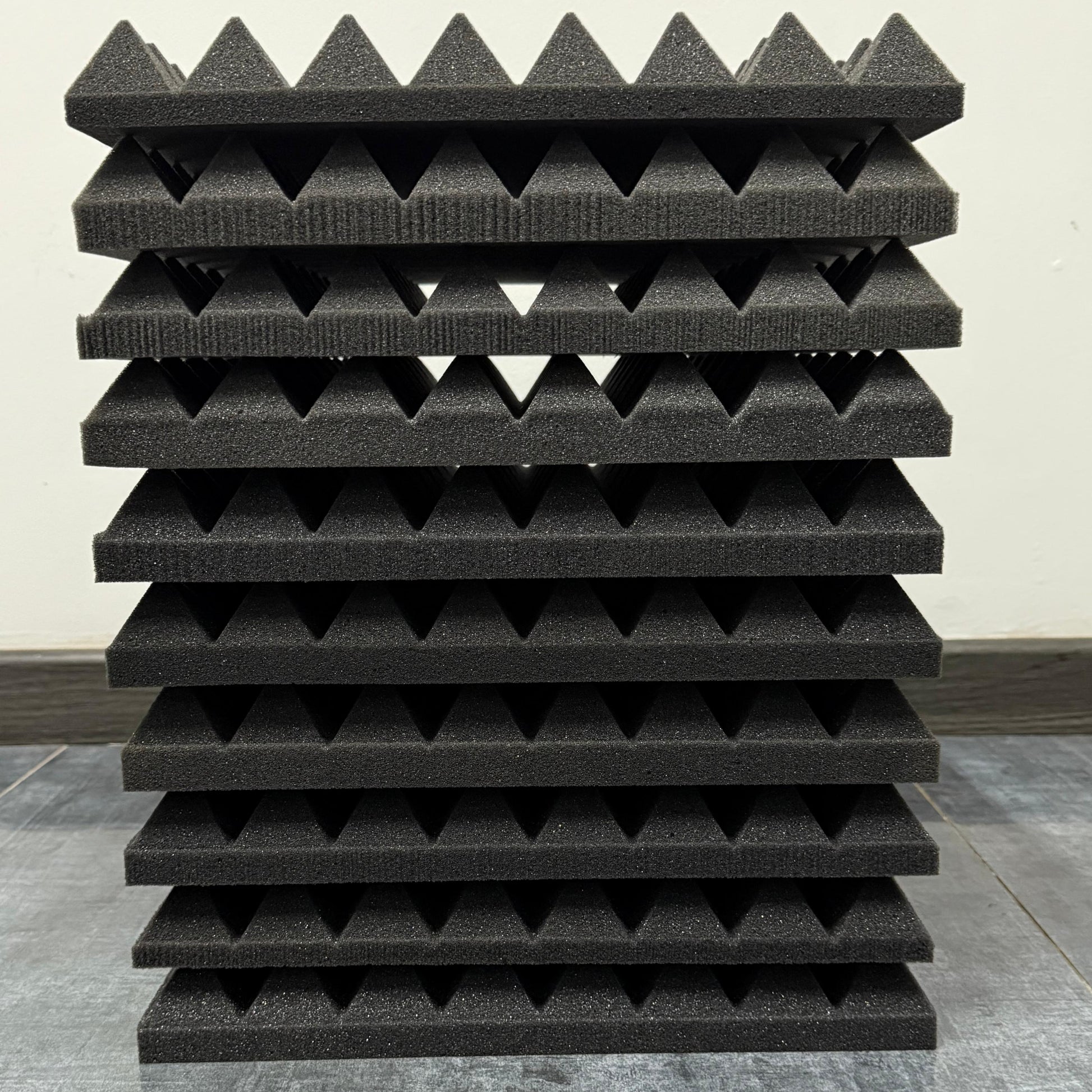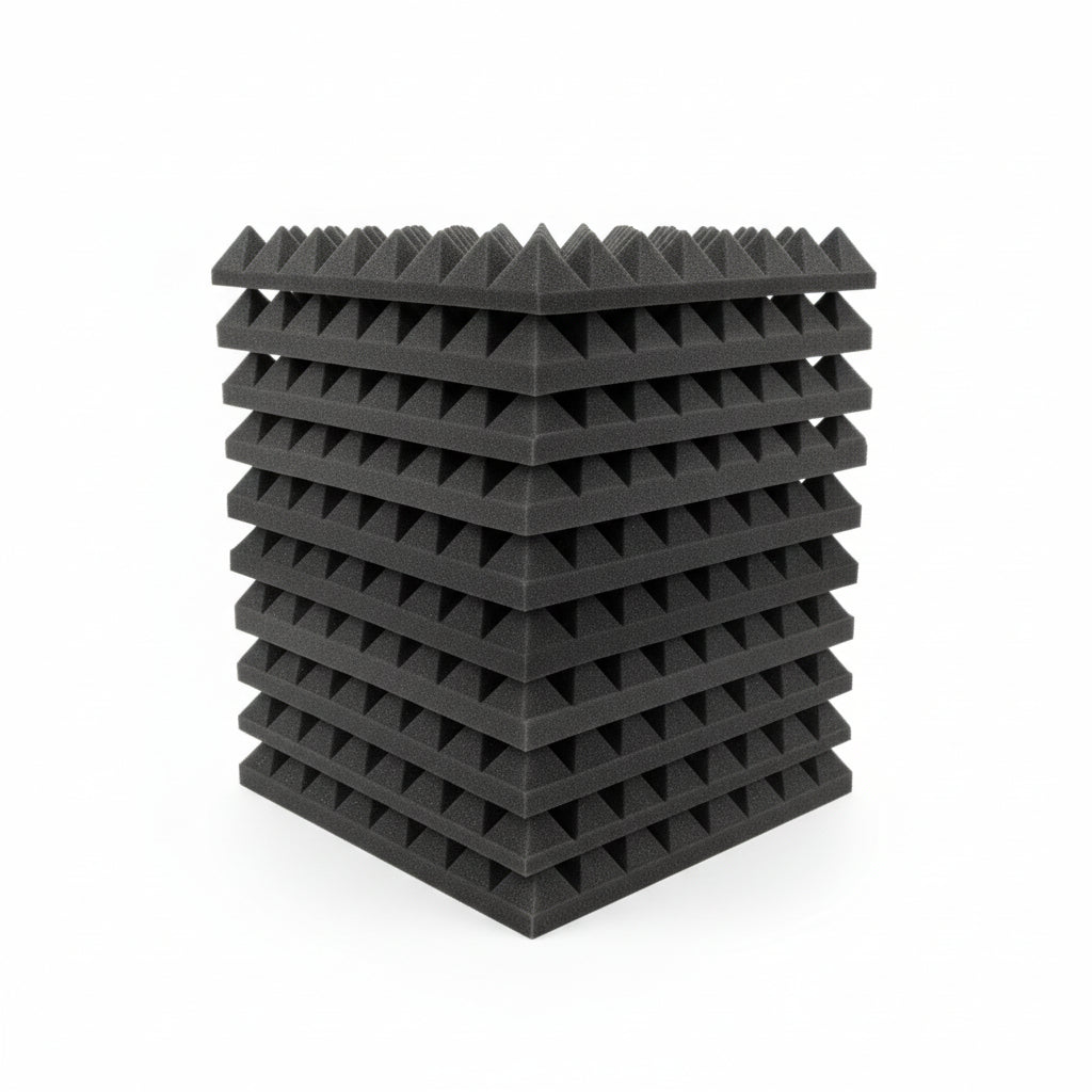 Diseño Piramidal Eficiente: La geometría de pirámide duplica el área de superficie de la espuma, atrapando las ondas sonoras de manera más efectiva que los paneles planos y eliminando el flutter echo (ese sonido metálico al aplaudir).